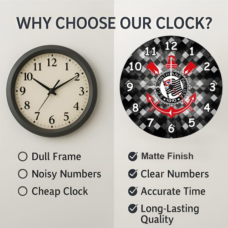Crafted from high-quality materials, this wall clock is lightweight, durable, and easy to hang. Its large, clear numbers ensure easy time reading, while the Corinthians-themed design adds a bold and sporty touch to any room.