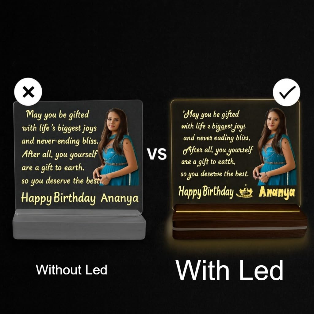 Personalized Acrylic LED Photo Frame with Wooden Base | Custom Birthday Gift with Name & Picture | Engraved Message Lamp with 12V Adapter (6x8 inch)