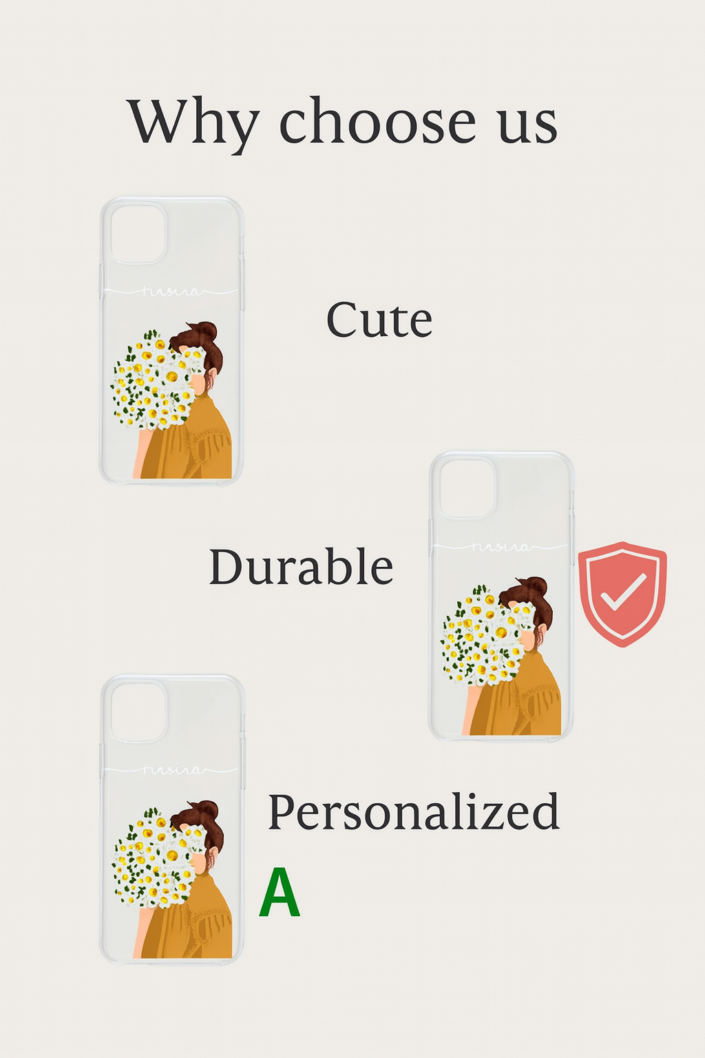 A charming and elegant phone cover designed for girls who love soft floral aesthetics. Featuring a cute daisy bouquet girl illustration with customizable name printing, the case blends beauty with durability. The soft shockproof TPU ensures daily protection while enhancing your style during travel, office hours or gifting moments. A perfect blend of cuteness and protection.